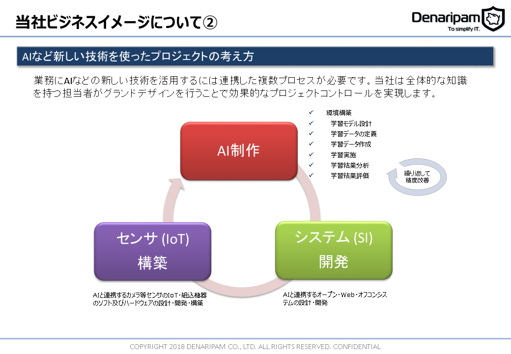 AI・IoT・ロボティクス・ビックデータなどを組みあわせた製品のデザイン及び開発、業務にAIなどの新しい技術を活用するためのグランドデザインや効果的なプロジェクトコントロールの実施を得意分野としております。