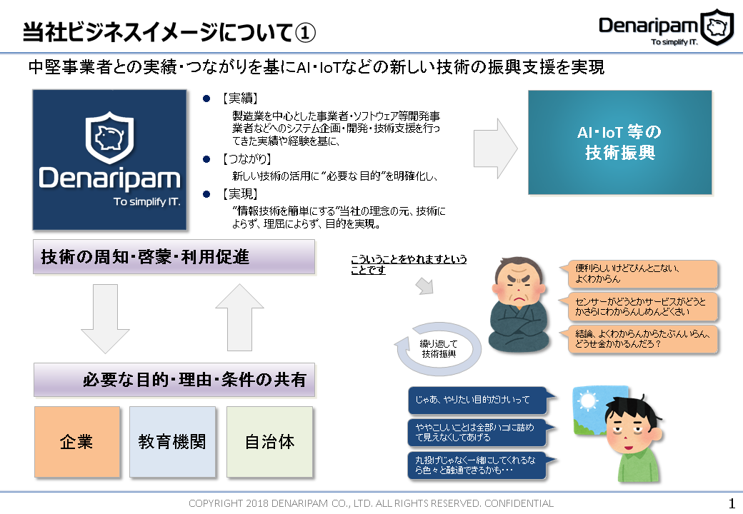 当社は情報技術を簡単にする事を理念とし、情報通信を活用した、 業種にとらわれない多様な技術開発やコンサルティングを行っております。