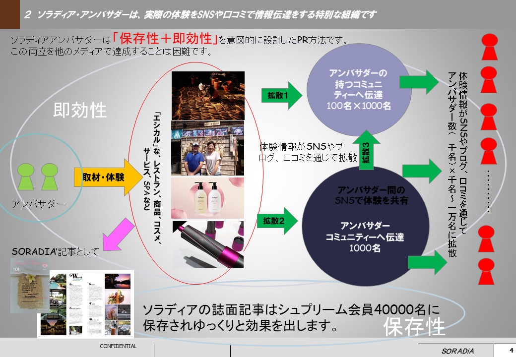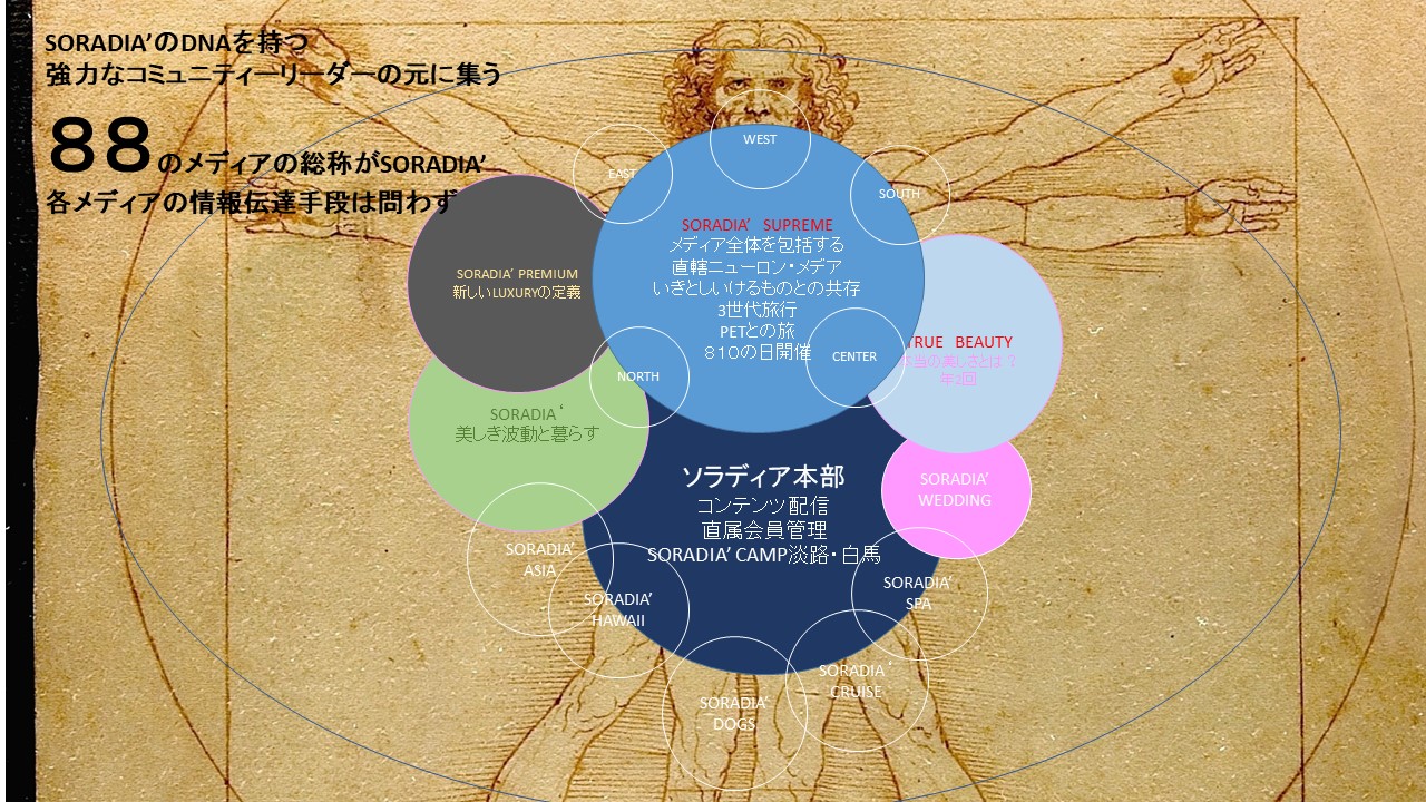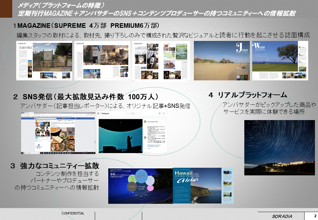 現在 「究極のLUXURYを体験する」SORADIA' PREMIUM 。「人と動物と地球の優しい関係を考えるメディア」SORADIA' SUPREME関西版の2誌を発刊しています。共に会員制で登録会員は60000人です。この会員様の中から商品やホテル、サービスを体験、レポート(誌面)、ご自身のコミュニティーへの情報拡散をしていただけるアンバサダーを2014年から組織して、運用しています。
