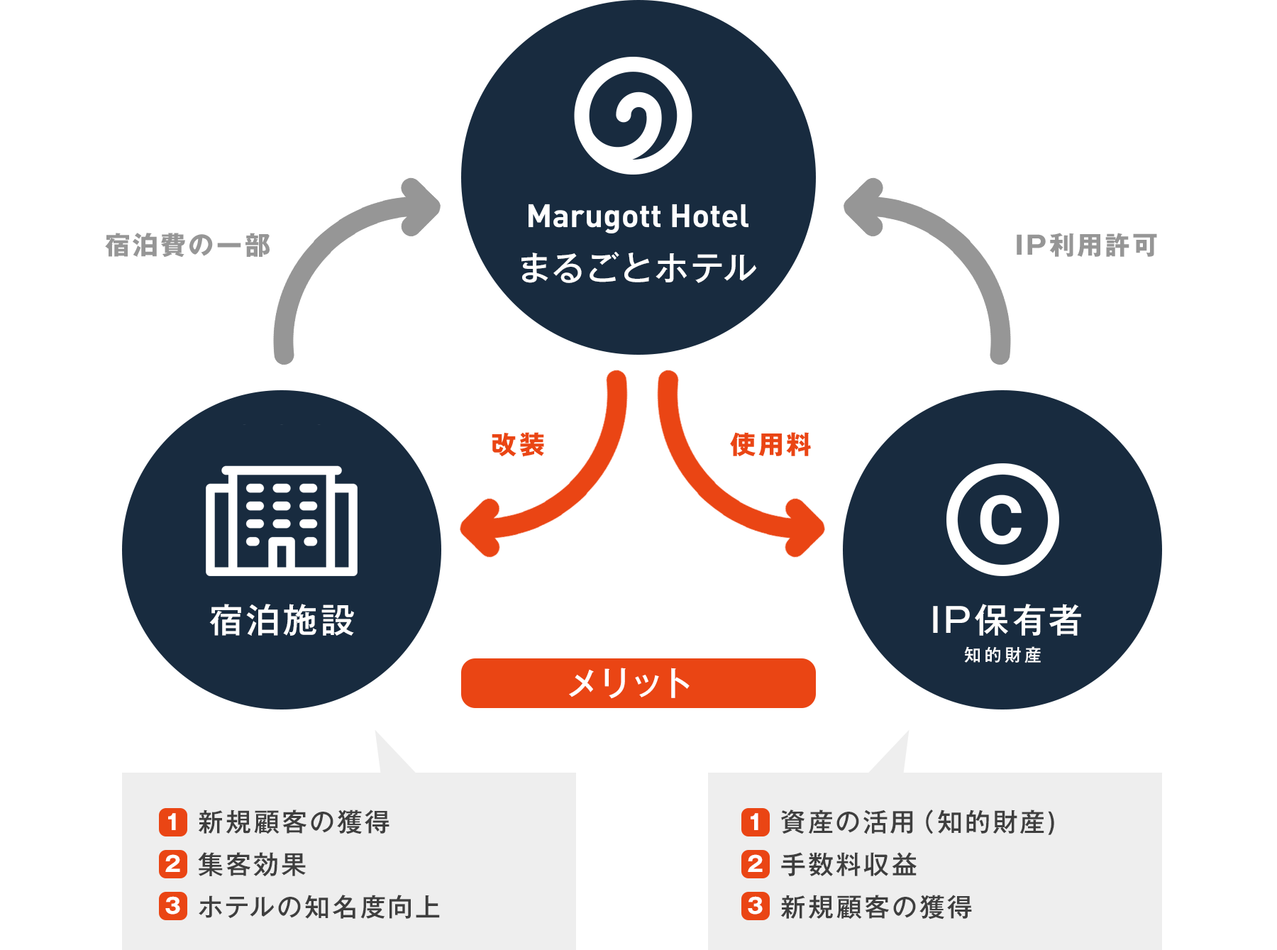 自社特徴:宿泊施設の内装を漫画やアニメといった知的財産を用いて改装。改装費用は無料で、レベニューシェアモデル。