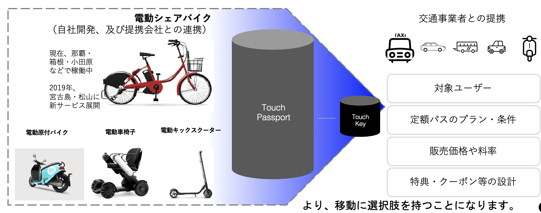 - Touch株式会社は、モビリティーシェアリングサービスを始点として、独自認証基盤や決済サービスを軸に展開し、自動車・自転車などの貸し借りのストレスフリーを実現します。 様々なモビリティーツールやサービスに独自デバイスを実装し、利用者属性や環境に即時即応するダイナミックな料金モデルの提供や新しい「移動」を日本に創っていきます。