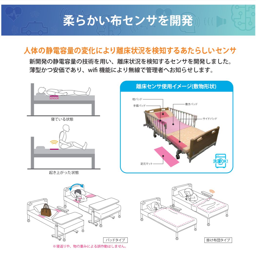 - 文部科学省「地域イノベーションエコシステム形成プログラム」補助事業として2016年度から5ヶ年の大学発地域創生事業開発プロジェクト。 (1) 非接触生体センサ 電波によって心拍数、呼吸数、体動を測ることができるセンサ技術 (2) 行動認識AI技術 スマートフォン内の加速度センサなどから機械学習により、介護・看護等の作業記録を推定・予測する技術
