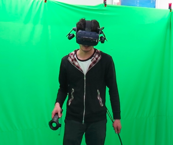 グリーンバック合成(背景にグリーンなどの色を配置して合成する手法)やデプス合成(カメラと被写体までの距離を算出し合成する手法)といった映像合成技術を駆使し、自分の手足などを仮想空間内で視認できるようにしている