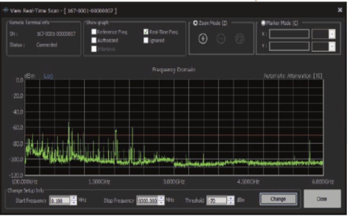 探知機1台で怪しい電波を25KHzから6GHzまで探知可能で解像度は25KHz,感度はマイナス100dBmからマイナス10dBm,探知可能な範囲は1台で150平方メートル。探知機の増設は300台まで可能。