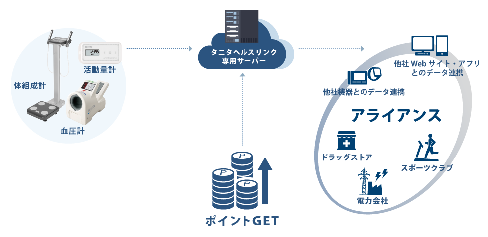 タニタヘルスリンクが提供しているWebサービス・アプリでのデータ活用のほか API提供による他社様サイト・サービスへのデータ連携の仕組みをご提供しています。