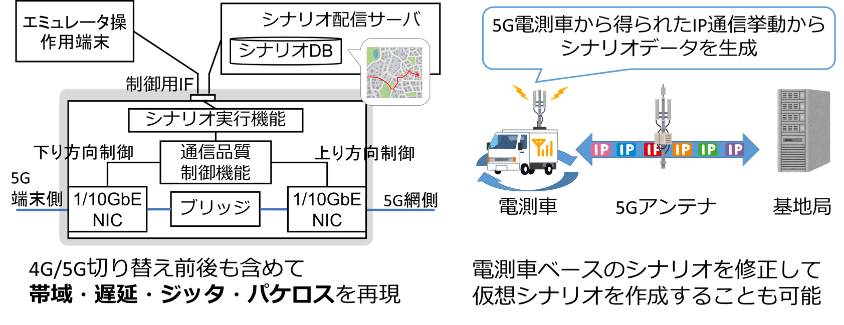 実測に基づき5G/4G通信環境をIPレイヤでエミュレートする当社独自開発のネットワークエミュレータ。