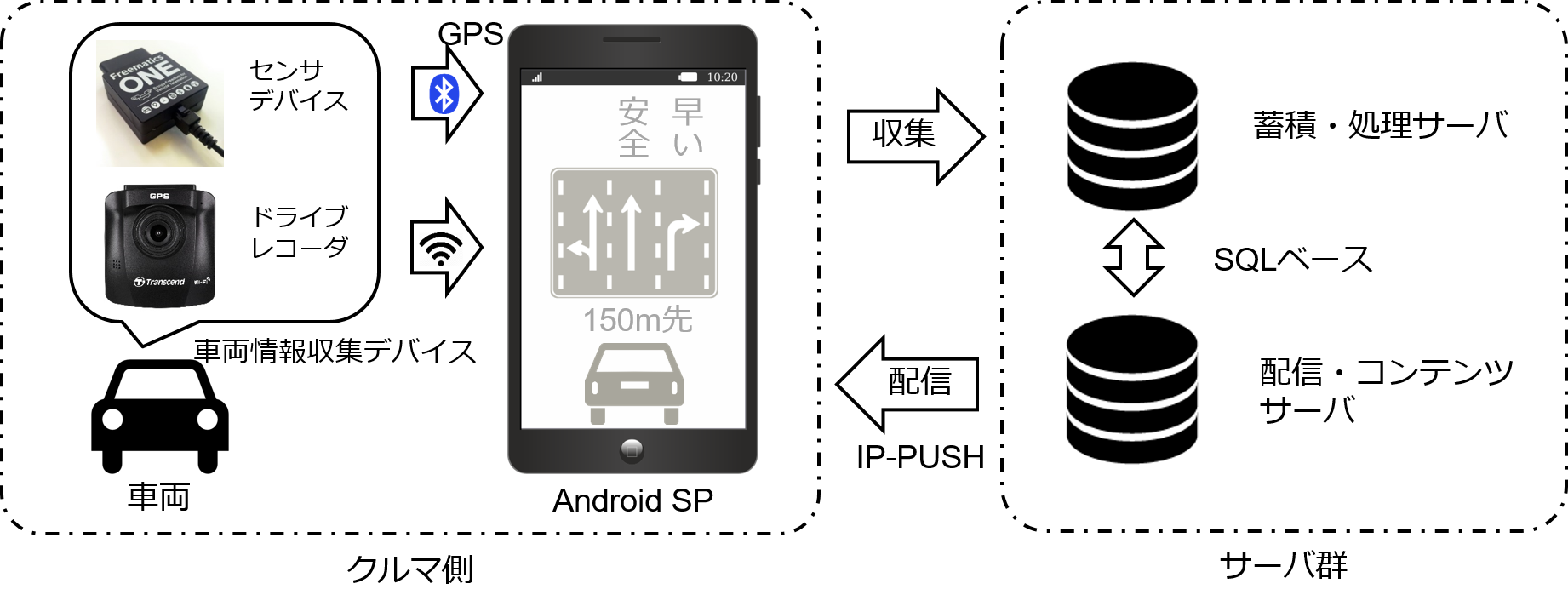 クルマや自転車等の運転データを蓄積・分析、加えて運転者端末へ向けアプリ・メッセージ配信可能な当社独自開発によるプラットフォーム