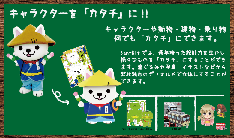 - あらゆるものを紙やPETで「カタチ」にする設計力を武器にパッケージはもちろん、店舗ディスプレイや販促POPなどを手掛けてきました。 そのノウハウを生かし、「デザインのちからとユーモア」をあたえてみる。そうすれば、今よりもっとおもしろいモノゴトと繋がっていく… ご当地をPRしているキャラクターや企業キャラクターなどを「カタチ」にした自社独自のオリジナルペーパークラフトブランド「ペパ道」を立ち上げ、新しい商材を生み出しました。 現在では、パッケージや、ディスプレイなどはもちろん効果的な販促ツールのご提案や商品企画、キャラクターデザインやグッズ、ノベルティなどお手伝いをさせていただいております。 San-Bitのできること ・基本的なカタチから、個性的なカタチのものまでありとあらゆるパッケージの設計。 ・「実用的」「目を引く」などニーズに合わせた、紙什器、販促ツールのご提案。 ・パッケージングや広告を包括的に考えた商品企画、ブランディング。 ・パッケージデザイン、広告、ロゴマーク、キャラクターデザイン。 ・オリジナルオーダーのペーパークラフト ・「ペパ道」商品の販売・卸