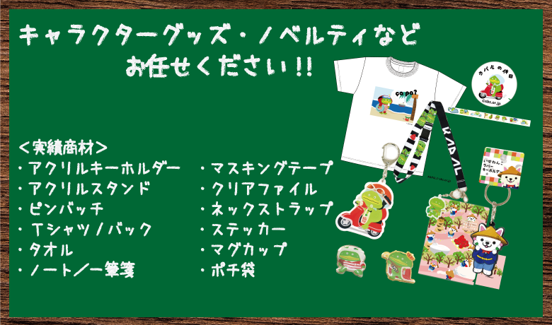 (PVCポーチ、アクリルキーホルダー、ボールペン、ぬいぐるみ、文具雑貨、アパレル関連など)