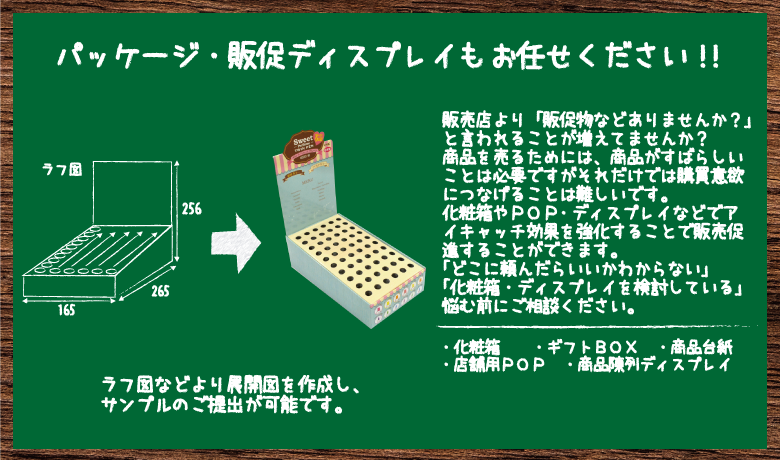 商品からパッケージ、販促ディスプレイまで一貫してご提案をさせて頂きます。