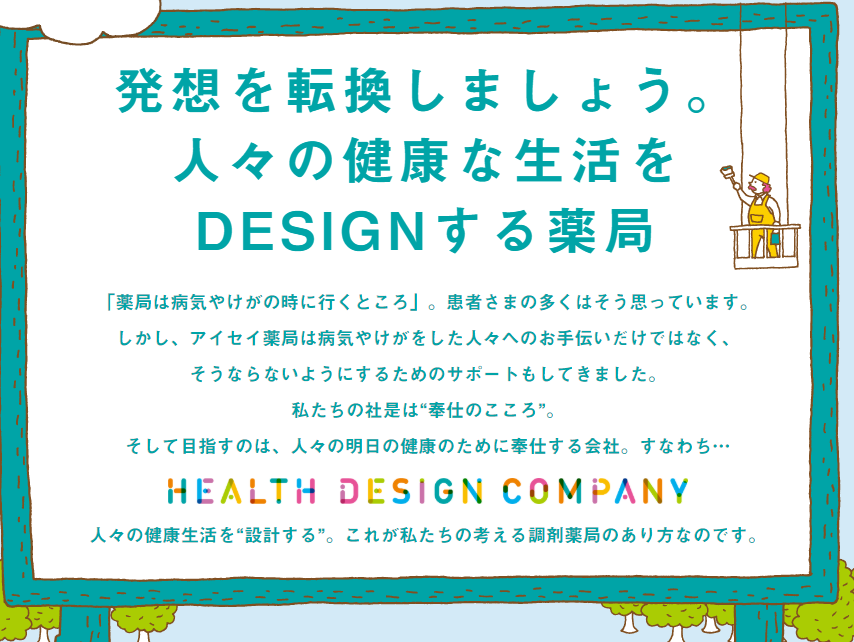 HEALTH DESIGN COMPANY として、調剤事業・介護事業を中心とし、地域の医療機関とともに地域医療の一端を担ってきました。これからは罹患された患者様の治療をよりよくすることはもちろん、未病部分も含め、積極的にITとリアルなチャネルをミックスし、健康をデザインする企業として、地域の方の健康増進を担っていきたいと考えています。
