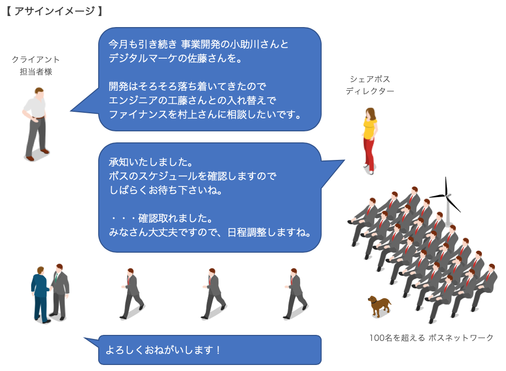 日本初、ボスのサブスクリプション「シェアボス」を運営。業界最高クラスの人材を、貴社のプロジェクトにアサインできます。デジタル系大企業のCxO・執行役員・事業責任者や、ベンチャー企業の経営者クラス100名以上が登録。