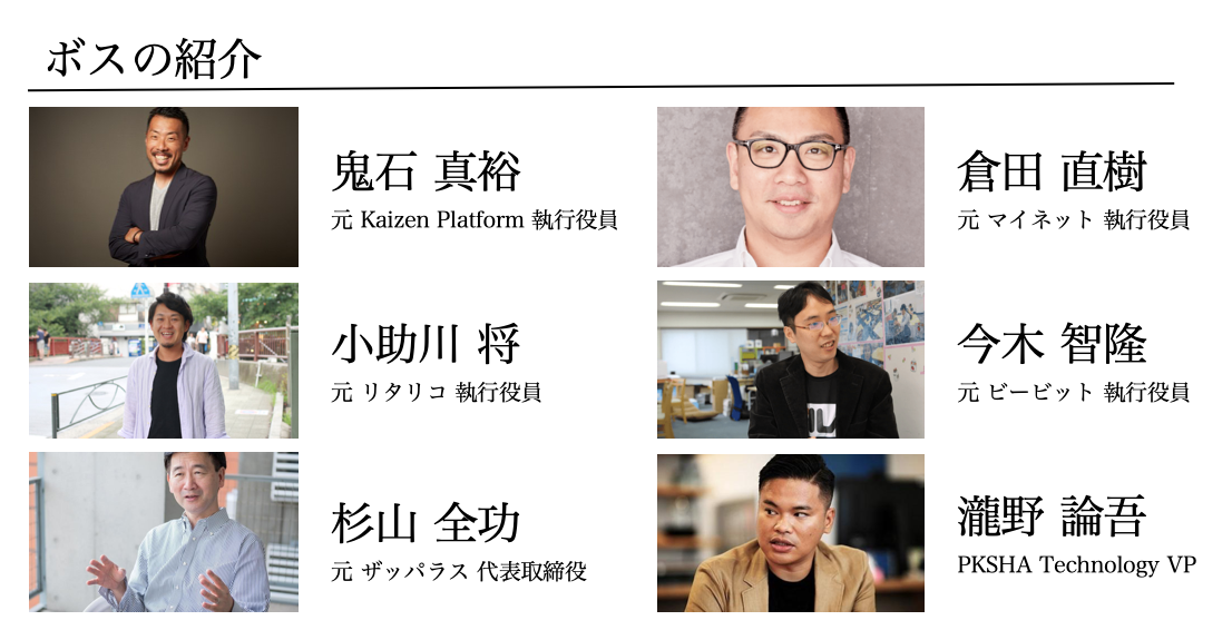 元Kaizen Platform 執行役員、元Google リードエンジニア、元GREE マネージャー、PKSHA Technology 執行役員、コンカー マーケティング本部長 、元SAP エンジニア、電脳交通 取締役、元NOREL事業責任者、元GREE GREE News 事業責任者、トライフォート社外取締役、元DeNA マーケティング責任者、元ビービット執行役員、元東芝子会社VP、元マッキンゼー、元ベインキャピタル、元マイネット 事業開発室長、元マイネットCFO、元中国国営企業子会社社長、元アーンスト・アンド・ヤング・キャップジェミニ、元デロイトトーマツコンサルティング シニアマネージャ、元Zynga社日本法人 管理責任者、株式会社UNCOVER TRUTH CAO、株式会社Faber Company CAO、元暮らしニスタ プロダクトマネージャ、元Adways Inc. 事業戦略統括 SVP、元サイバーエージェント 営業マネージャ、日本ディープラーニング協会 理事長