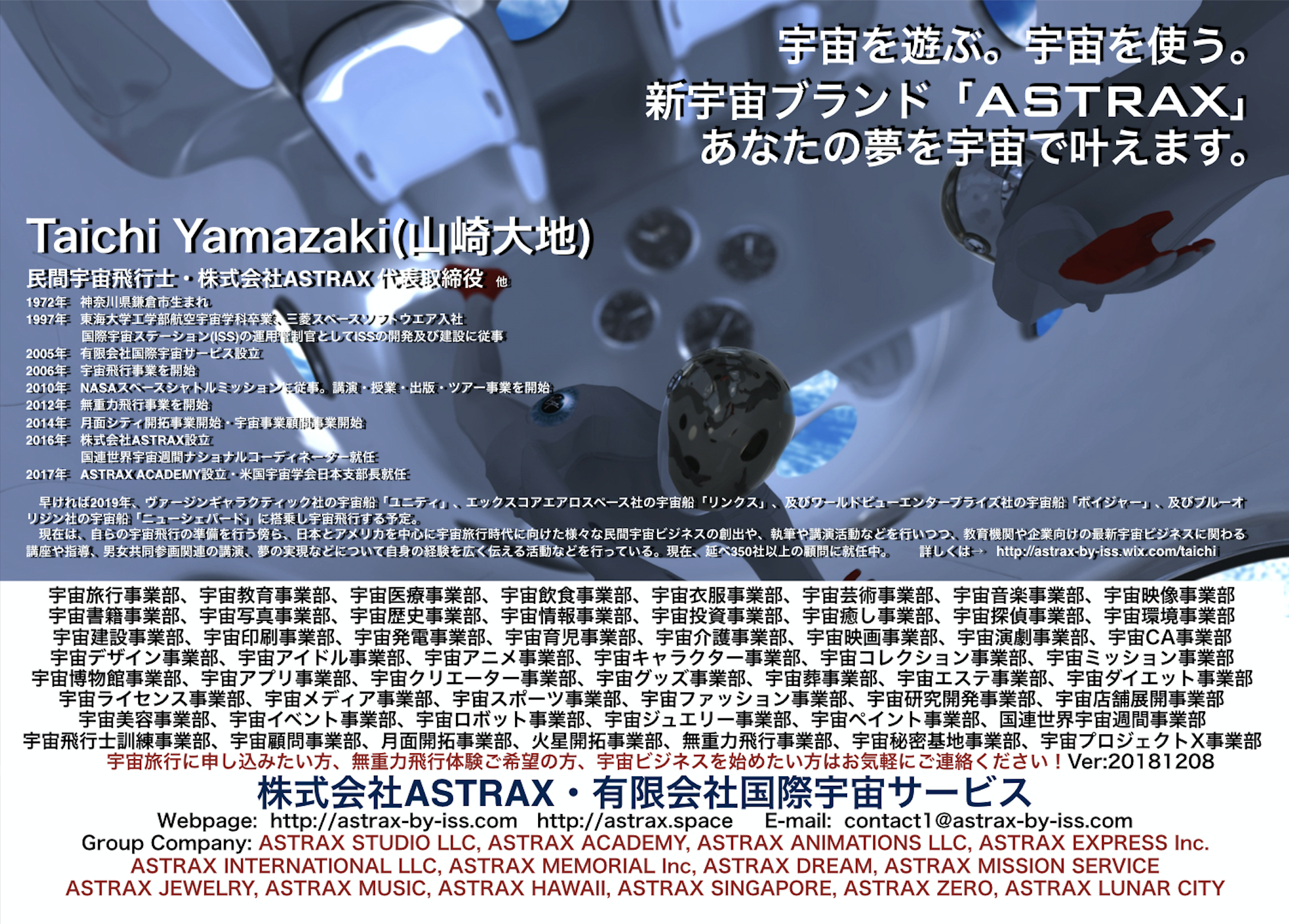 - 宇宙飛行事業(宇宙旅行含む) 無重力飛行事業 月面開拓事業 講演事業 民間宇宙事業拡大事業 など民間宇宙関連事業73事業 <弊社の宇宙インフラと宇宙飛行サービスや付随サービスの技術やノウハウを生かした宇宙旅行産業の拡大に向けた共創・協業について面談のお願い> はじめてご連絡させていただきます、株式会社ASTRAX(有限会社国際宇宙サービス)の山崎と申します。 民間宇宙旅行時代を見据えて、民間宇宙飛行産業に関わる15年のキャリアがございます。 10月にはワシントンDCで開催された世界最大の国際宇宙会議で太陽系経済圏(生活圏)構築構想を発表しました。 ブロックチェーン技術を用いて、太陽系全体で利用できる宇宙サービスプラットフォームを構築中です。 当社の73に及ぶ民間宇宙サービスの技術や経験やノウハウと、述べ500事業者のネットワークを活用した貴社との共創モデルに関して、まずは是非ともディスカッションの場をいただきたくご連絡を差し上げた次第です。 アマゾンが月面に、スペースXが火星にコロニーを作ろうと本気で動いています。 弊社は月面に街づくりをするために、250以上の事業パートナーとともに計画を進めております(地上のビジネスとの連携)。 特に宇宙や月面など、無重力状態や1/6重力の状態でのヘルスケアはとても重要な分野です(地上のヘルスケアにも応用)。 また、地球〜宇宙ステーションや宇宙ホテル、地球〜月、地球〜火星などの物流について考えている企業はまだほとんどありません(弊社はグループ会社のASTRAX EXPRESS社とASTRAX INTERNATIONAL社が担当)。 日本から世界を経由して月や火星までの太陽系物流網を作りませんか? さらに、世界では月面資源探査も活発に行われています。 協業できる分野は多岐に渡ります。 ぜひ共同研究や共同開発などができたらと考えております。 共同研究成果は国際論文をバンバン書いて、国際会議を通じて世界に発表し、世界の企業とも連携して開発を進めてまいります。 そしてスピーディーに実証実験を行い、宇宙の未来創造と地球の社会問題解決のために貢献していけたらと思っております。 つきましては、貴社をご訪問の上、 内容を詳しく説明申し上げたく存じます。 下記の日程でご都合のよろしい日はございますでしょうか。 当日は、弊社代表で民間宇宙飛行士をしております私が伺います。 〈訪問候補日時〉 11月25日以降(時間はなるべく合わせられるようにいたします) ご都合のよい日時をご連絡いただければ幸いです。 ご検討の程、何卒よろしくお願い申し上げます。