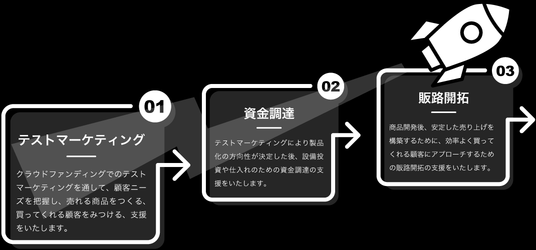 テストマーケティング→資金調達→販路開拓と、新しい挑戦の立ち上がりから軌道に乗るまでを支援しています。
