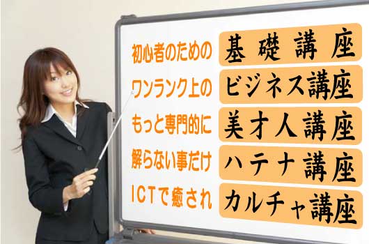 ・教室の特徴:専門用語に慣れて頂くためにインストラクターは専門用語を喋りますので解らない所は都度質問してください。決まったコース意外に「ハテナ講座(お客様の解らない事だけに答える)」もあり、答えられない場合は料金がかかりません。また当教室は入会金や会費など不要です。使っただけの料金になりますのでお忙しい方には特に好評で、しかも予約制になっています。