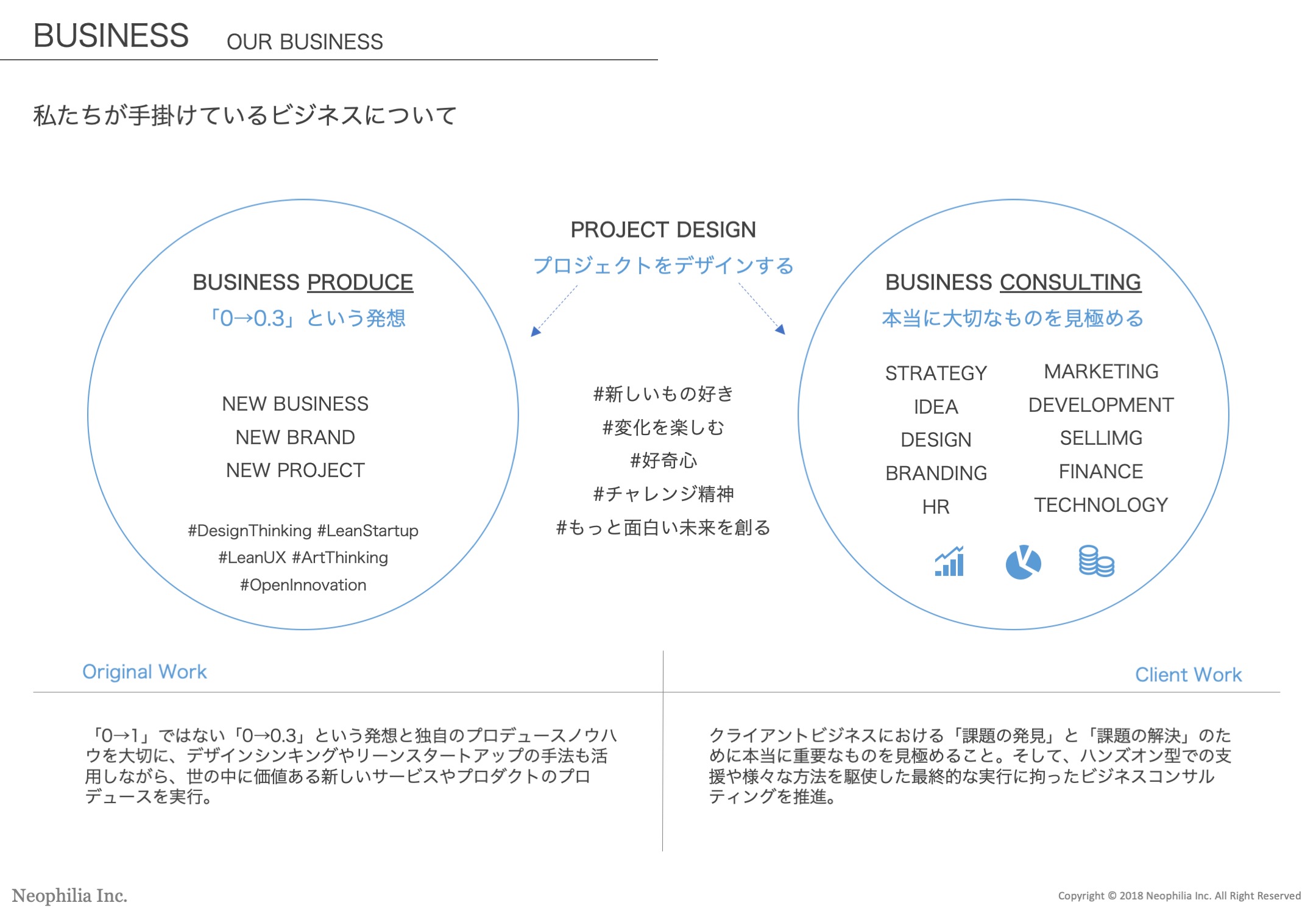 私たちは、NEOPHILIA(=新しいもの好き)という未来の価値創造に必要な要素をアイデンティティとして、もっと面白い未来を創ることに挑み続けます。