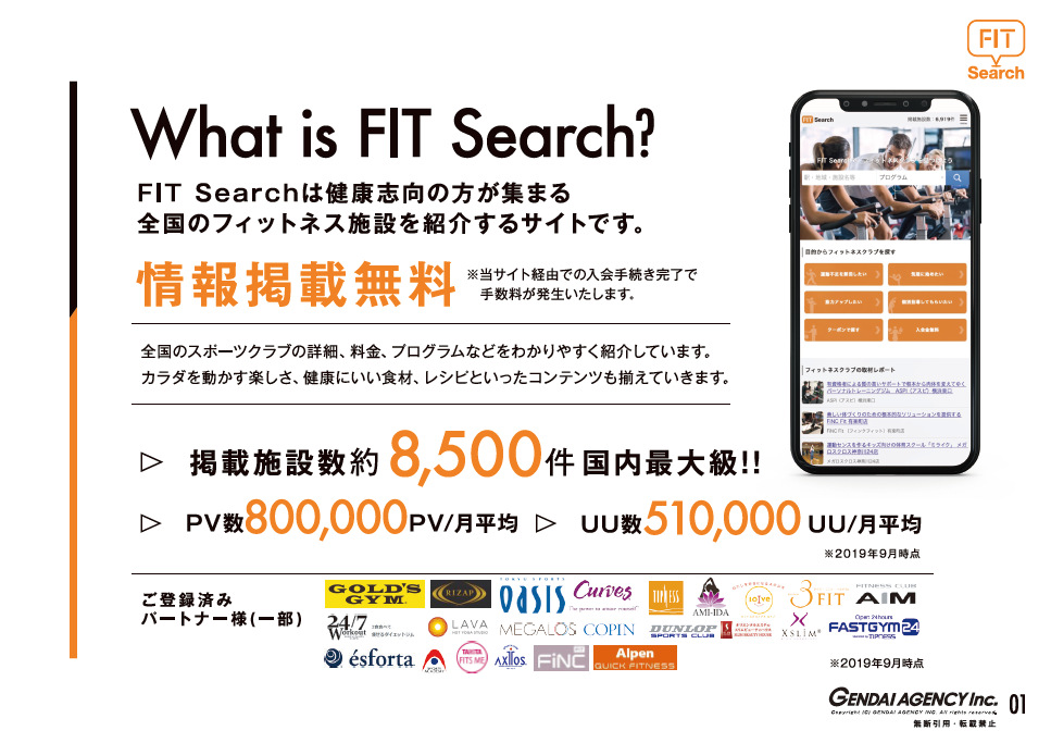 フィットネス業界最大の検索サイトFIT Searchを軸に、フィットネス業界が盛り上がる、日本国内のフィットネス参加人口増加に向けた取り組みを共に出来るパートナー企業を募集しております!