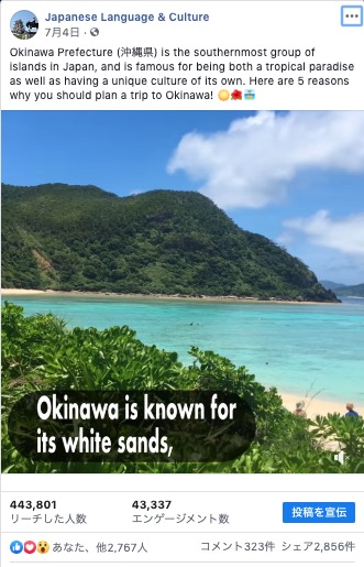 5ヶ月前に弊社が作成し、自社FBにて投稿した観光地PR動画は 広告無しで 44万リーチ、いいね 2700、コメント300、シェア2800を超え、現在も伸び続けています。(イメージ写真1参照)