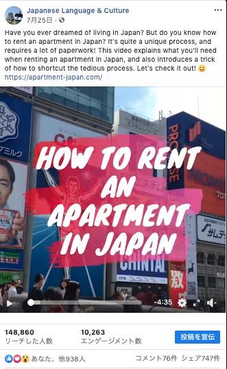外国人向け賃貸マンション検索からリース契約までできる画期的なウエブサイトのPR動画を作成、自社FBページにて投稿。広告なしで 配信5日で10万リーチ、3万再生回数、いいね 687、シェア 560を記録。(追記:投稿より1ヶ月弱で、再生回数は 4.2万回、いいね 915、シェア 738 に成長)