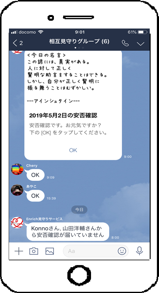 2019年7月からはグループLINEによる適度な距離を保ちつつ、人とのつながりによってお互いの無事を確認できるつながりサービスを追加しました。