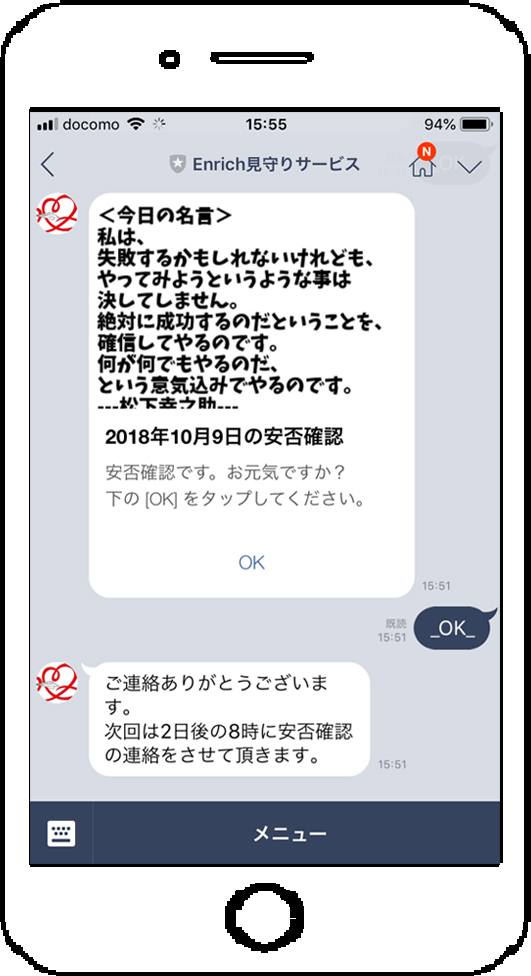 もし、OKを忘れた場合は24時間後に再送し更に3時間経過しても確認されない場合は、直接利用者に電話連絡して確認。利用者とコンタクトできない場合は、登録された近親者に連絡して状況をお知らせ。