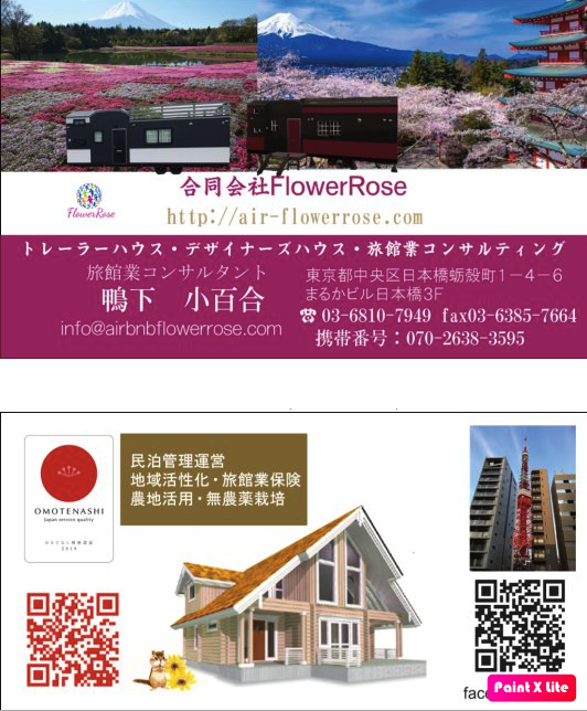 - トレーラーハウス・ログハウスの販売代理業・地域活性を目指し、宿泊施設を作り営業予約代行をしています。 中古の家をリフォームして民泊施設に変える許可申請も受けております。