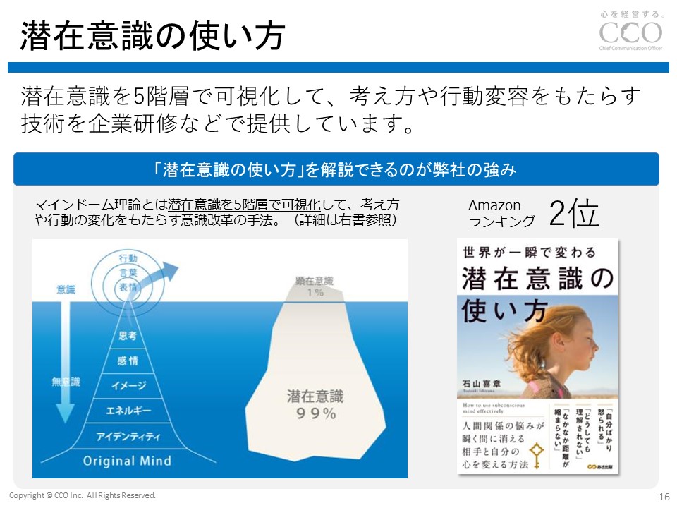 代表の著書「世界が一瞬で変わる潜在意識の使い方」(あさ出版)は、2015年10月にAmazonランキング2位を獲得し、発売から数年たった今年4月にも明林堂書店の週間ランキングで3位にランクインするなど、根強い人気を誇っています。