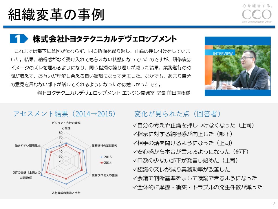 - 1.組織風土の変革コンサルティング 2.経営理念の浸透 3.研修(階層・テーマ別) 4.コーチング(1on1) 5.声紋分析アセスメント 6.人事評価制度の設計
