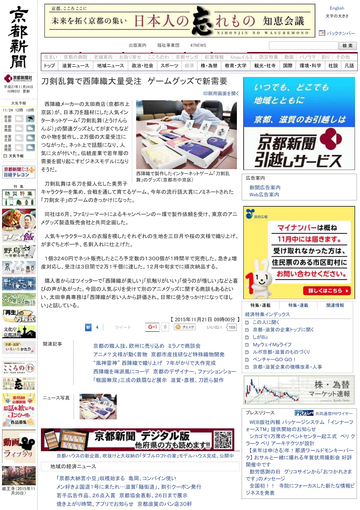 西陣織を用いた刀剣乱舞製商品3点制作(がま口、名刺入れ、ポーチ)、2万点受注販売