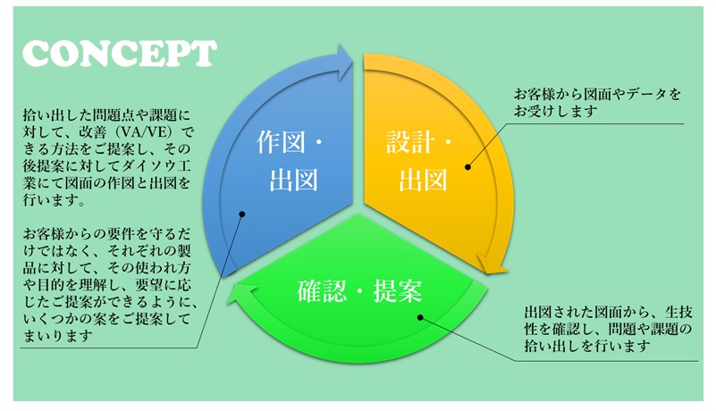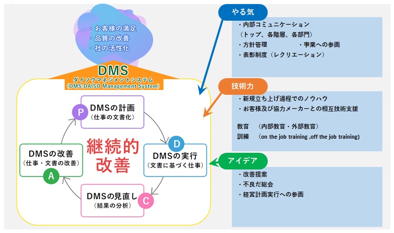 大量生産の ”自動車事業” にて培われた技術と管理をともに、ダイソウ独自のマネジメントシステム(通称:DMS)を作りっております。これによりお客様には品質・デリバリーに対する強い信頼を得ております。