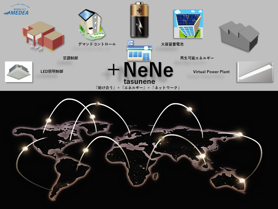 高圧需要家様の基本料金を下げることで大幅な節電を実現する、多数の導入実績を誇るデマンドコントロール機能を中心に、単に空調や照明を制御するだけでなく、再エネや蓄電システムまでをも統合し、AIで天気予報を先読みし、デマンドコントロールの確度を更に上げていき、Virtual Power Plant機能をも内包した先進のEnergy Management System「+NeNe」。「助け合う」+「エネルギー」+「ネットワーク」の造語が「+NeNe」です。