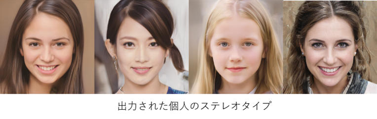 我々の研究室では深層学習、特に敵対的生成モデルであるGANを用いることにより個人が持っているステレオタイプの可視化を行うことが可能です。人間は相手の顔からその人の印象を判断する際に自身が潜在的に持つステレオタイプとのマッチングにより印象判断を行うという仮説があります。例えば相手の顔から美しいという印象を判断する際には自身が潜在的に「美しい」という印象を最大化する顔画像を保持しておりその顔画像と相手の顔の類似度を基準に相手の「美しい」度合いを推測します。我々は画像生成モデルを用いることで個人の行動からこのステレオタイプを可視化することが可能です。