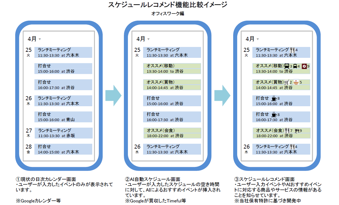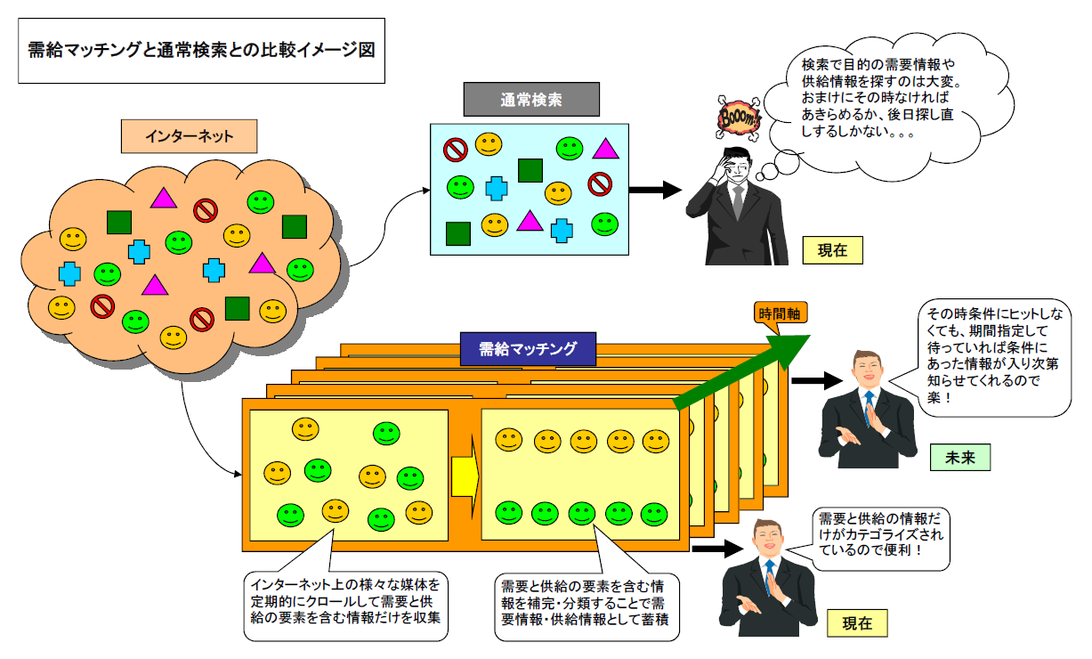 そこで、商品やサービスの提供者であり供給者側の代表である企業様に当社取り組みの意義とメリットをご理解いただき『時間情報付き需給情報』をご提供いただくこと、および環境整備のための開発等にご協力いただくことで、来たるべき『スケジューラーコミュニケーション』時代の環境整備とプラットフォームづくりを共に推進することが当社の願いです。