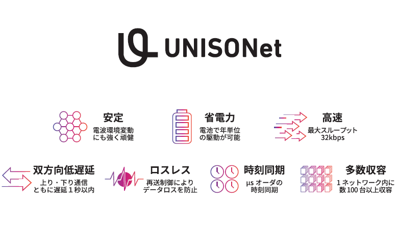 UNISONetは、安定・省電力・高速・双方向低遅延・ロスレス・時刻同期・多数収容といったIoT無線に求められる機能・性能を、すべて同時に実現することが可能です。