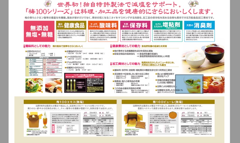 - 「おいしさと健康の両立」をめざし業界の定説にとらわれない発想・製法による商品開発に取り組む。塩分、食品添加物ゼロの梅果汁、梅肉、梅漬けの開発に成功。特許を取得。現在は「完熟梅たまり」「完熟梅みのり」を商品化し好評販売中。