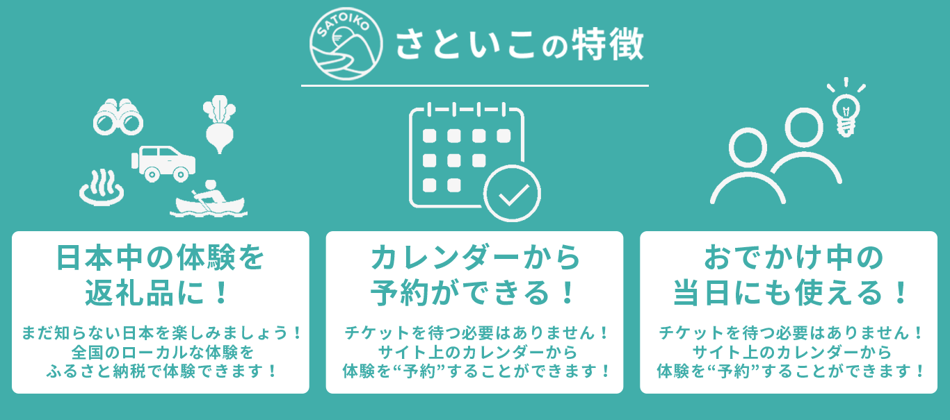 - 地方創生支援事業全般 ・体験特化型ふるさと納 税ポータルサイト「さといこ」運営 ・体験型返礼品開発支援 ・観光商品開発支援 ・インバウンド観光支援 ・自治体コンサルティング ・広報/PRサポート 【東京都知事登録旅行業第2-7812号所有】