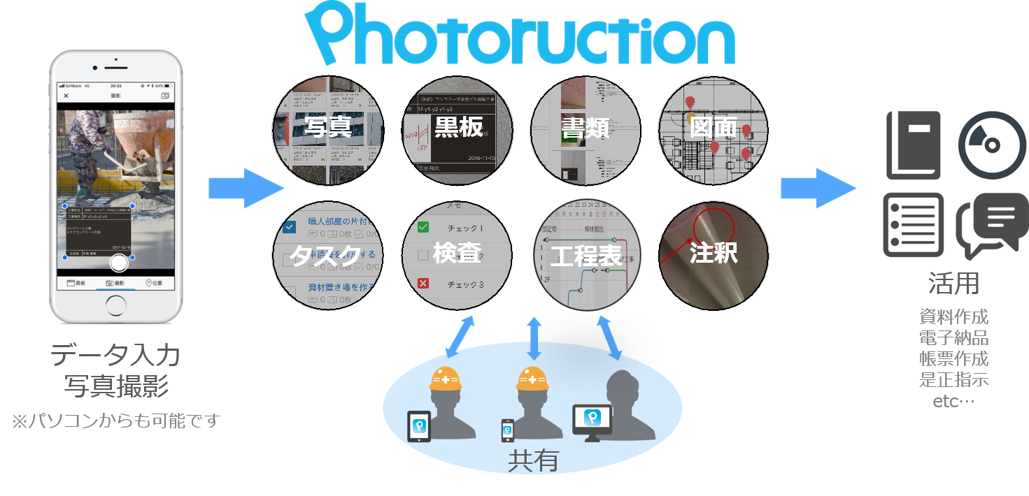 Photoructionは、データ整理や資料作成などの煩雑になりがちな業務を効率化し、業務時間の削減や生産性の向上を実現します。リリース約2年で約30,000プロジェクトに導入されています。