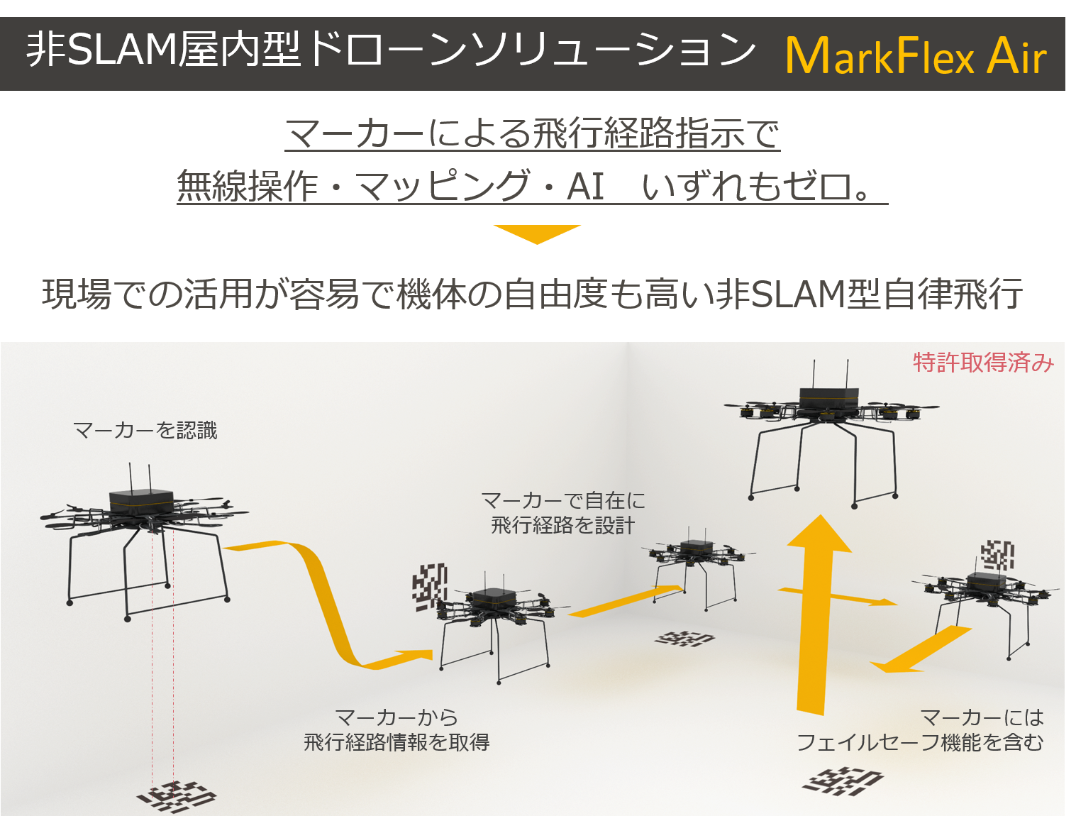・非GPS環境下における、SLAMを用いないドローン自律飛行技術(MarkFlex®︎Air)。この技術は飛行指示とフェイルセーフ指示が含まれたマーカーによってドローンを自律的に飛行させるものです。