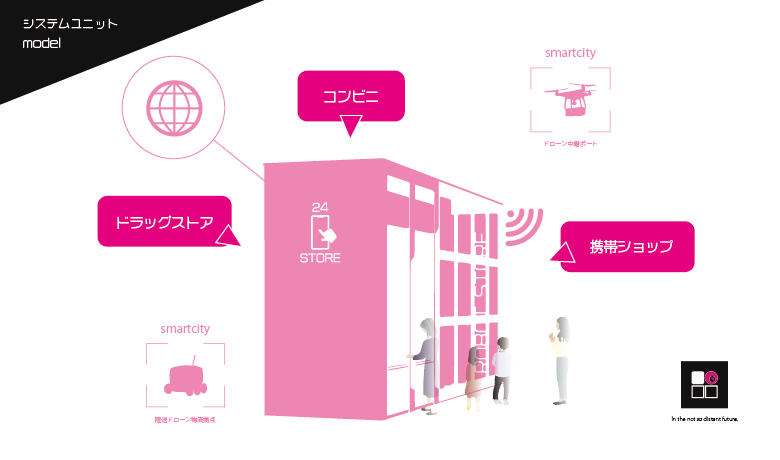 生活インフラサービスの新拠点の構想です。少子化による小売店でのサービス人材不足、EC市場拡大による配達員不足など一挙に解決します。未来のスマートシティーでは必ずこの新拠点が存在します!