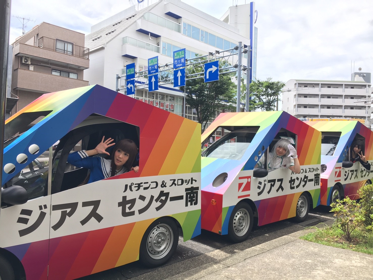 単体だとあまり目立たない小型宣伝カーも5台連なると圧巻!SNSへの二次的拡散が期待できるようになりました。