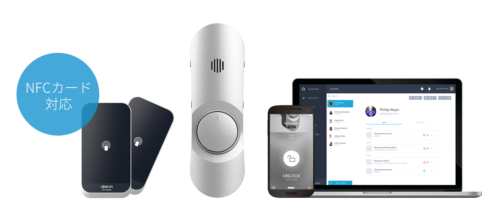 キーレス社会の実現に向けて、後付け可能なスマートロックを活用したクラウド型「Akerun入退室管理システム」を法人向けに提供。セキュリティ、入退室/勤怠管理、スペース無人運営まで幅広いニーズに対応。