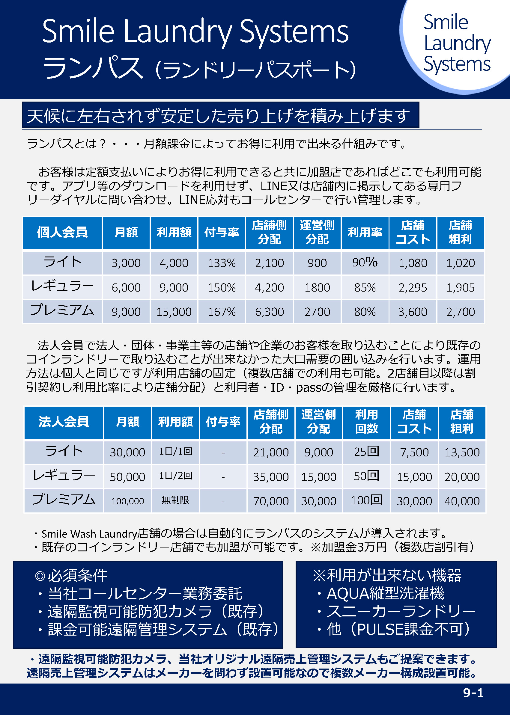 法人会員で法人・団体・事業主等の店舗や企業のお客様を取り込むことにより既存のコインランドリーで取り込むことが出来なかった大口需要の囲い込みを行います。運用方法は個人と同じですが利用店舗の固定(複数店舗での利用も可能。2店舗目以降は割引契約し利用比率により店舗分配)と利用者・ID・passの管理を厳格に行います。