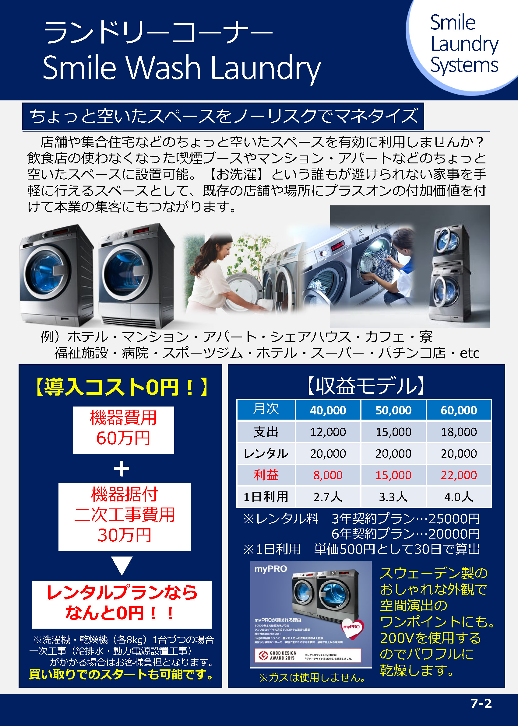 レンタルで初期投資0円から始められるランドリーコーナーのご提案。店舗や集合住宅などのちょっと空いたスペースを有効に利用しませんか?飲食店の使わなくなった喫煙ブースやマンション・アパートなどのちょっと空いたスペースに設置可能。【お洗濯】という誰もが避けられない家事を手軽に行えるスペースとして、既存の店舗や場所にプラスオンの付加価値を付けて本業の集客にもつながります。