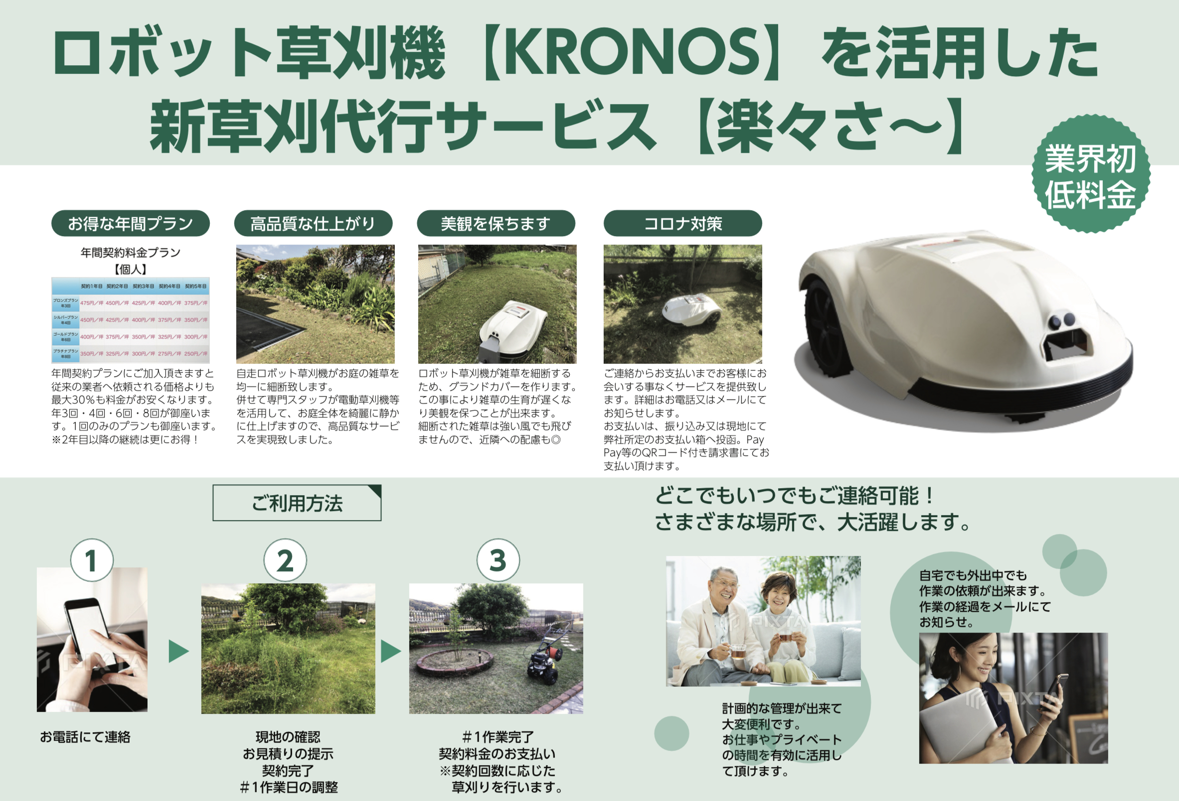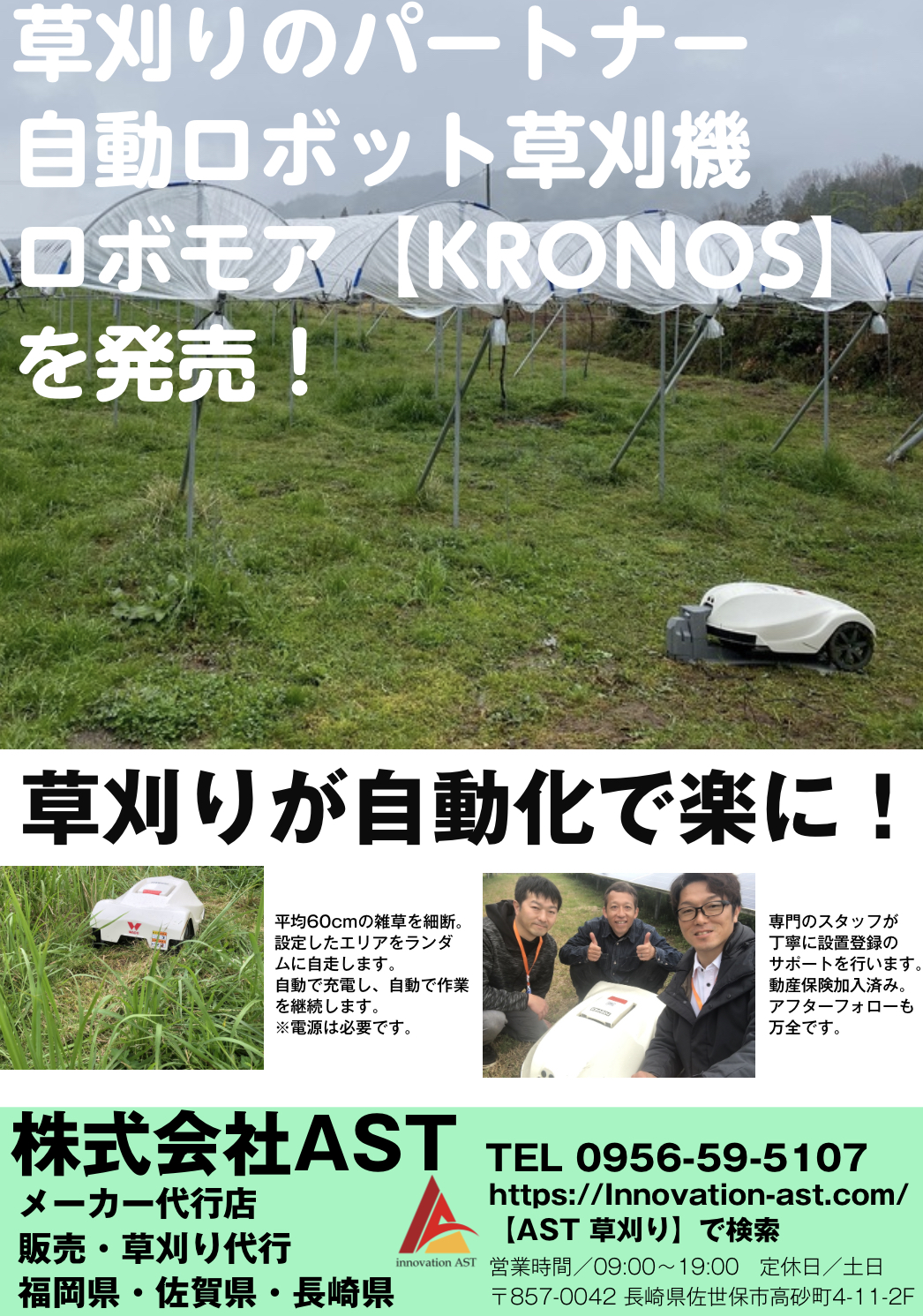 ロボモア【KRONOS】のメーカー代行店。 新草刈り代行サービス【楽々さ〜】を手掛ける草刈り専門業者。 弊社独自の知識とノウハウをフランチャイズ化し、リソースを提供致します。