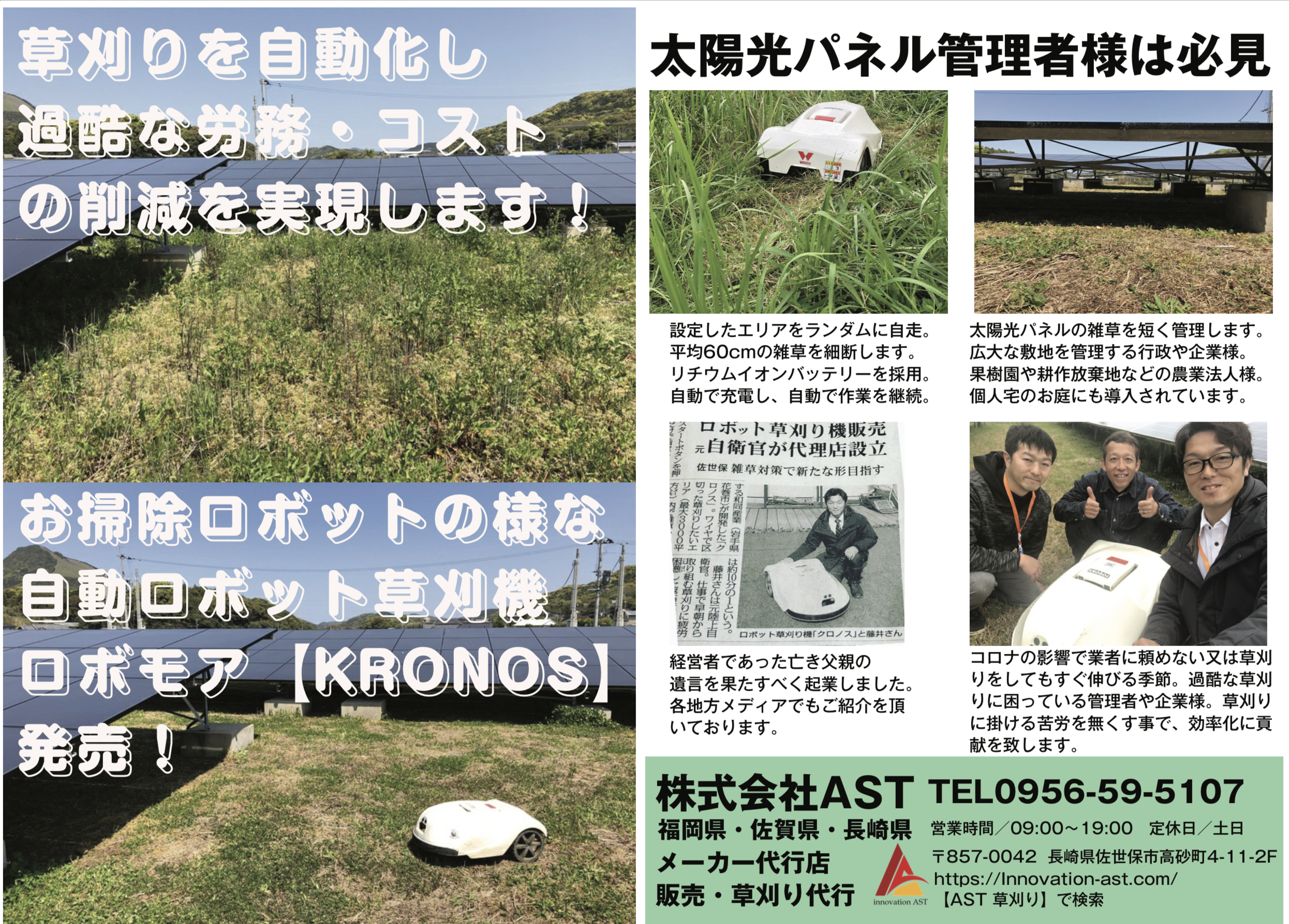 ・当初は九州から草刈り代行サービス及びロボモア【KRONOS】の販売を拡充します。