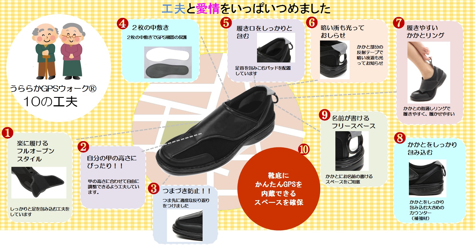 - 社会問題となっている認知症等での徘徊行動の見守りの為のGPS機器等を安心・確実に保持していただく為の靴”うららかGPSウォーク”を開発・販売。