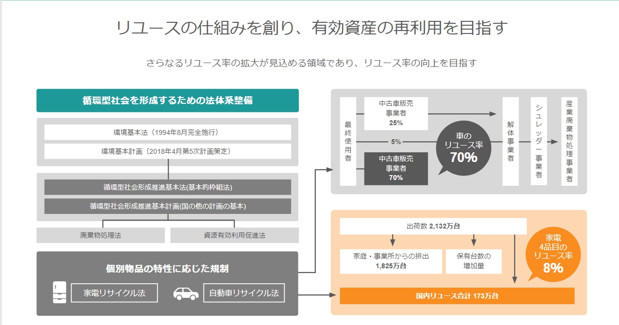 車のリユース率70%と比較すると、家電4品目のリユース率は8%と拡大が見込める領域です。