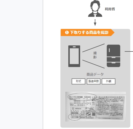 業者間の売買データを約7万件蓄積しているため、すぐ売れる価格設定が可能。この仕組みを活かした下取りスキーム「下取りチェッカー」は大型冷蔵庫からスタートさせ、シェア獲得の後はリユース可能な全ての家電を下取りするプラットフォームへ成長させます。