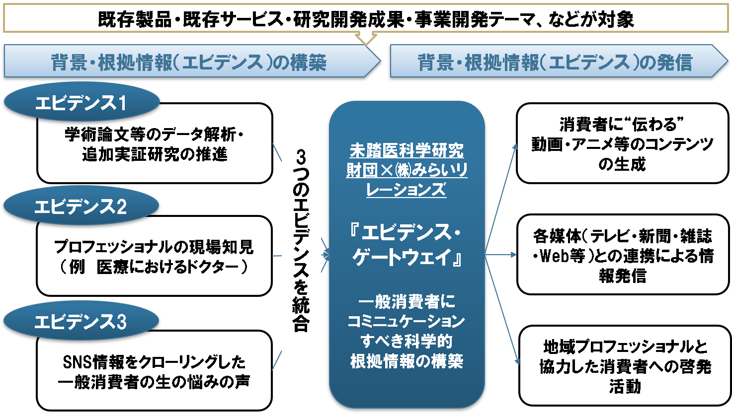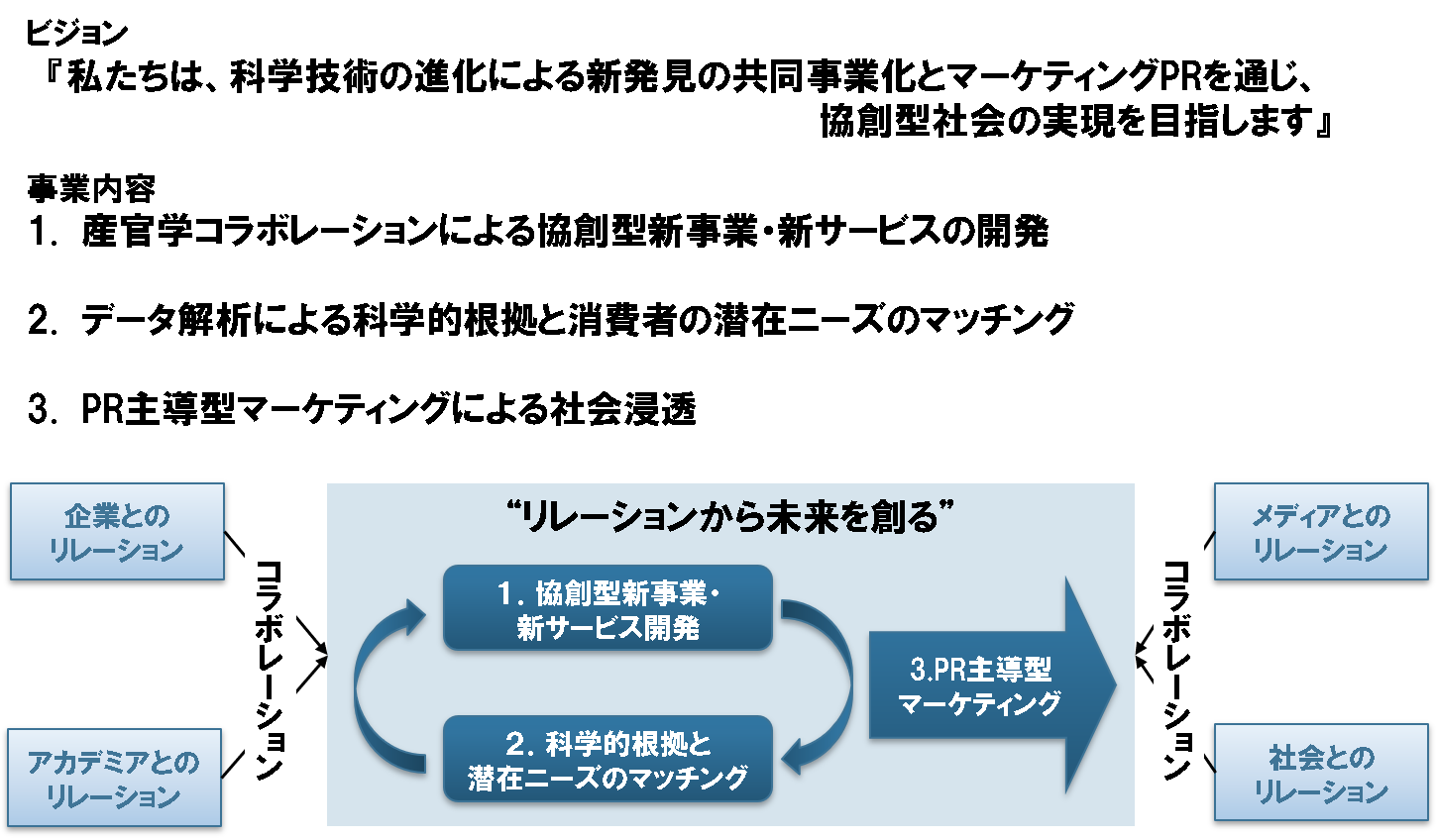 ・私たちは、企業と研究機関との協創により、これらの知財をビジネスとして構築し、メディアPRの手法を活用して世の中に広めていく活動を行っております